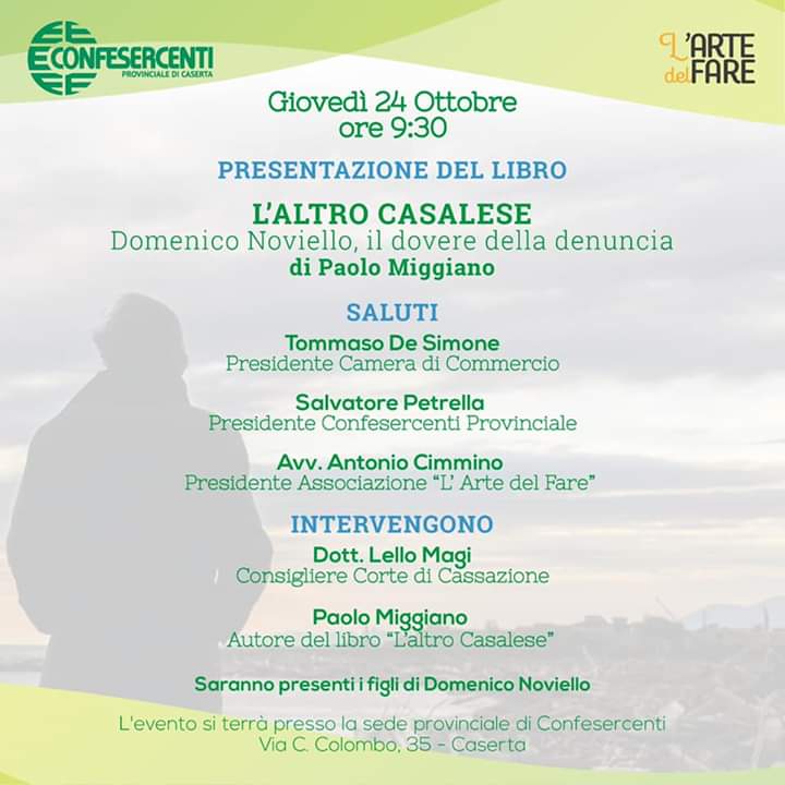Giovedi 24 ottobre ci sarà la presentazione del libro "L'altro Casalese" di Paolo Miggiano presso la sede provinciale di Confesercenti, ci saranno i saluti del Presidente della Camera di Commercio Tommaso De Simone, il Presidente Confesercenti Provinciale Salvatore Petrella e il Presidente dell'Associazione "L'Arte del Fare" Antonio Cimmino. Inoltre interverranno il Consigliere della Corte di Cassazione Lello Maggi e lo stesso Paolo Miggiano.