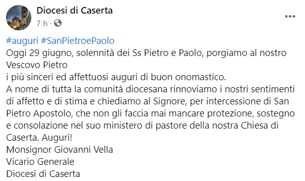 Questo quanto apprendiamo dalla pagina fb della Diocesi di Caserta: "auguri San Pietro e Paolo Oggi 29 giugno, solennità dei Ss Pietro e Paolo, porgiamo al nostro Vescovo Pietro i più sinceri ed affettuosi auguri di buon onomastico. A nome di tutta la comunità diocesana - si legge nella nota - rinnoviamo i nostri sentimenti di affetto e di stima e chiediamo al Signore, per intercessione di San Pietro Apostolo, che non gli faccia mai mancare protezione, sostegno e consolazione nel suo ministero di pastore della nostra Chiesa di Caserta. Auguri! Monsignor Giovanni Vella Vicario Generale Diocesi di Caserta"
