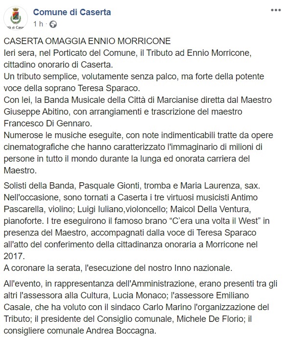 Questo quanto apprendiamo dalla pagina facebook del Comune di Caserta: