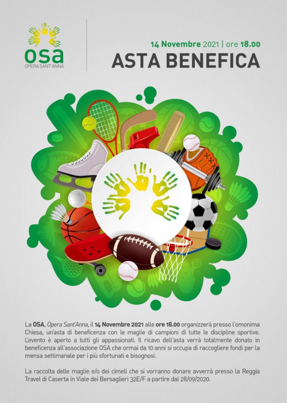 Domenica 14 novembre sarà la giornata mondiale in settimana a Caserta si sono svolte varie iniziative con lo scopo di risvegliare le coscienze per far crescere carità e solidarietà verso che ne ha bisogno. L’asta programma per le 18 è di beneficenza, ed è nata da un’idea di Francesco Marzano, saranno proposte al miglior offerente le maglie ed i gadget dei campioni di tutti i tempi e di tutte le discipline sportive. All’asta anche tante maglie e altri gadget del Napoli, tutti ricevuti grazie alla buona intercessione di Gianluca Grava, responsabile del settore giovanile della squadra azzurra e soprattutto, casertano doc. Gianluca, figlio di Adriano, indimenticata bandiera rossoblù degli anni ‘70, ha avuto una carriera in crescendo. Iniziando dalle giovanili e poi dalla serie D, è arrivato fino alla serie A ed a giocare in Champions con la maglia del Napoli che sentiva addosso come una seconda pelle. Grazie alla sua sensibilità e disponibilità, come quelle di tanti altri sportivi casertani e non come Vincenzo “bum bum” Moretti, Franco Marcelletti, Gigi Castaldo saranno molte le maglie ed i cimeli che saranno messi all’asta. L’evento è aperto a tutti – con le vigenti limitazioni - ma appassionati, curiosi, semplici benefattori e collezionisti potranno partecipare e offrire per aggiudicarsi una maglia un cimelio appartenuto ad un campione dello sport. Il ricavato dell’asta verrà totalmente donato in beneficenza all’associazione OSA, che da ben dieci anni si occupa di recuperare fondi per finanziare la mensa settimanale che fornisce pasti ai più sfortunati e bisognosi. E’ un modo diverso, alternativo e partecipativo per raccogliere indirettamente dei fondi per regalare un piccolo aiuto e un sorriso alle persone in difficoltà. Sono tanti finora gli amici che hanno accettato di fare da battitori, fra questi anche il sindaco di Caserta Carlo Marino, la chef stellata Rosanna Marziale, il bronzo olimpico di Los Angeles Angelo Musone, ma sono attese le conferme di altri illustri e famosi potenziali battitori. All’asta andrà la maglia numero 14 di Dries “Ciro” Mertens con la quale l’attaccante belga ha stabilito il record di gol con la maglia del Napoli, poi quella indossata da Ciro Immobile nell’ultima partita con la nazionale italiana, quella autografata indossata dall’ex milanista “Kakà” nel corso di un derby contro l’Inter, la canotta di Andrea Cinciarini capitano dell’Armani Basket Milano, la maglia da riscaldamento autografata di Oscar Schmidt indossata per l’addio al basket, l’Oscargame, la maglia rossoblù autografata dall’ex numero 10 della Casertana Gigi Castaldo, la maglia di Rivaldo del Barcellona, del difensore D'Ambrosio dell’Inter con tanto di autografo, poi la tuta autografata di Franco Marcelletti indossata per la finale di Coppa Italia vinta a Bologna contro la Di Varese Varese il 23 marzo del 1988, la maglia del calciatore Vincenzo Moretti autografata che indossava ai tempi in cui militava nell’Avellino, la canotta griffata Pepsi di di Randy Childress e quella di Mario Balotelli del Manchester City. Ci sono le maglie che Francesco Totti (numero 10) e Cristiano Ronaldo (numero 7) hanno indossato con le nazionali. Fra i cimeli c’è la foto di Muhammad Alì o Cassius Clay, autografata con tanto di dedica al pugile marcianisano Angelo Musone bronzo alle olimpiadi di Los Angeles nel 1984, al quale fu scippato l’oro dalla giuria."