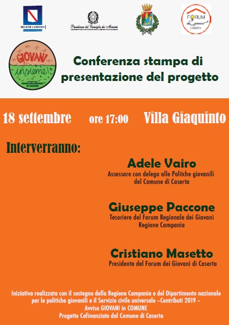Il 18 settembre, alle ore 17:00 si terrà in Villa Giaquinto la conferenza stampa di presentazione del progetto del Forum dei Giovani di Caserta, "Giovani Insieme!". All'incontro interverranno l'Assessore con delega alle Politche giovanili del Comune di Caserta, Adele Vairo; il Tesoriere del Forum Regionale dei Giovani Regione Campania, Giuseppe Paccone ed il Presidente del Forum dei Giovani di Caserta, Cristiano Masetto.