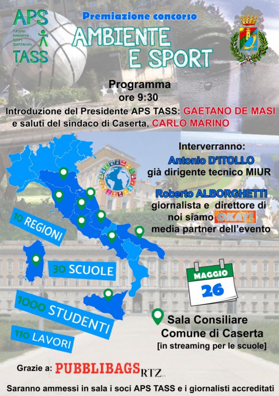 Mercoledì 26 maggio alle ore 9:30 si terrà, nella sala consiliare del Comune di Caserta mentre per le scuole in streaming, la premiazione del concorso "Ambiente e Sport". Saranno presenti il Presidente APS TASS Gaetano De Masi, il Sindaco Carlo Marino, e non solo.