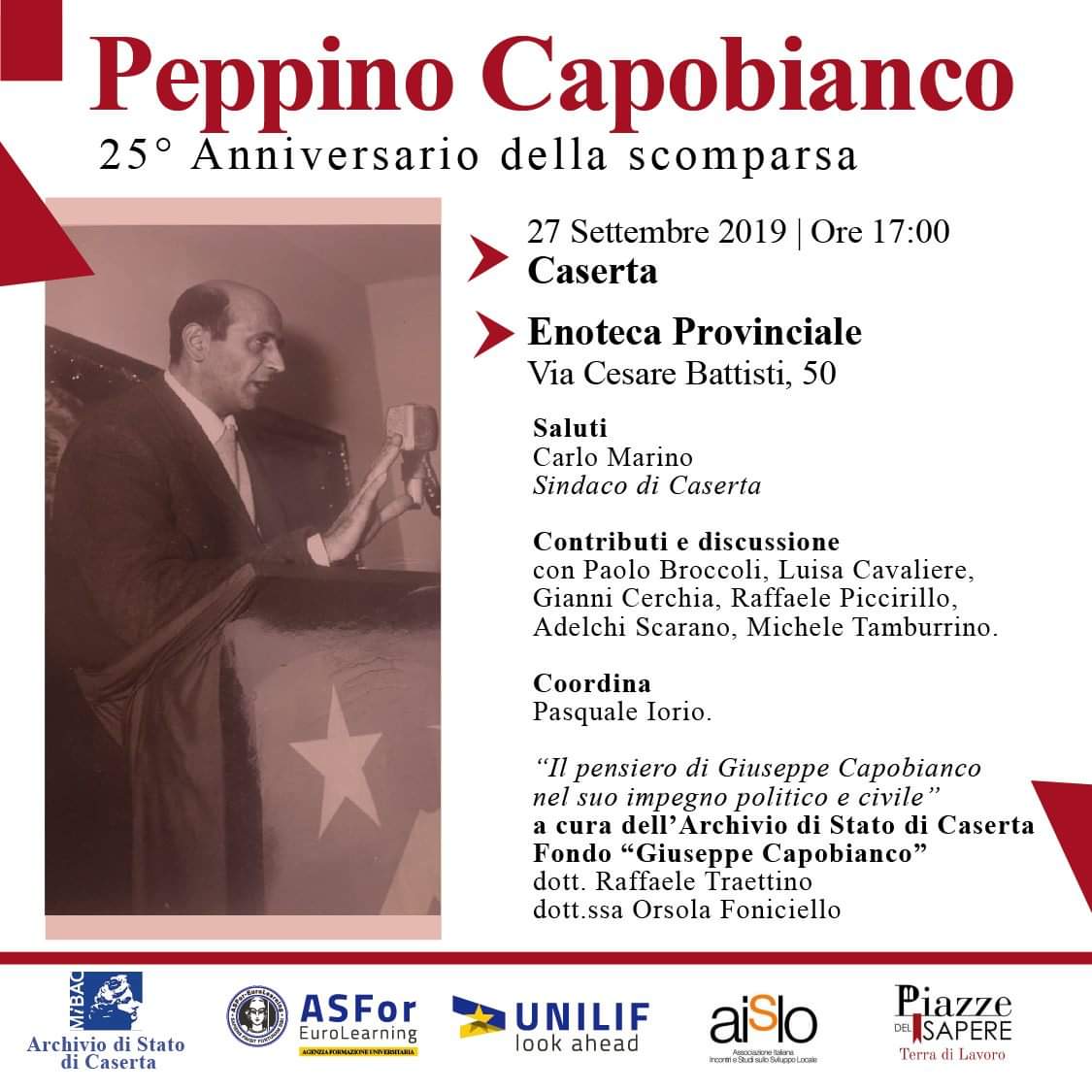 Il prossimo 27 settembre presso l'Enoteca Provinciale in via Cesare Battisti alle ore 17 sarà celebrato il 25° Anniversario della scomparsa di Peppino Capobianco. Presenzieranno alla manifestazione il Sindaco di Caserta Carlo Marino, Paolo Broccoli, Luisa Cavaliere, Gianni Cerchia, Raffaele Piccirillo, Adelchi Scarano, Michele Tamburrino e coordinerà Pasquale Iorio.