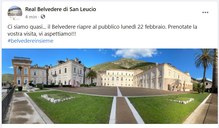 Questo quanto pubblicato sulla pagina fb del Real Belvedere: "Ci siamo quasi... il Belvedere riapre al pubblico lunedì 22 febbraio - si legge nella nota -. Prenotate la vostra visita, vi aspettiamo!!!"