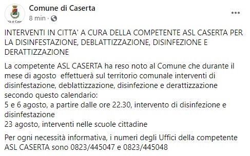 Questo quanto apprendiamo dalla pagina fb del Comune di Caserta: "INTERVENTI IN CITTA' A CURA DELLA COMPETENTE ASL CASERTA PER LA DISINFESTAZIONE, DEBLATTIZZAZIONE, DISINFEZIONE E DERATTIZZAZIONE