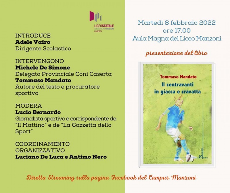 Martedì 8 febbraio 2022, alle ore 16.00 - nell’Aula Magna del Liceo “Manzoni” e in diretta Facebook sulla pagina Campus Manzoni – si terrà la presentazione del libro “Il Centravanti in Giacca e Cravatta” di Tommaso Mandato. Un evento promosso- si legge nella nota- dalla Dirigente Scolastica Adele Vairo, con la collaborazione del Dipartimento di Scienze Motorie e Sportive (SMS), coordinato dal Professore Luciano De Luca e dal Referente d’Indirizzo delle SMS Professore Antimo Nero. L’incontro si inserisce in un ricco ciclo di eventi di “cultura sportiva”, organizzati dal Liceo “Manzoni”, al fine di ampliare la propria offerta formativa per il Liceo Scientifico con Potenziamento Sportivo, unico nel capoluogo di provincia a promuovere lo Sport come cultura. La mission è quella di favorire e rafforzare un’immagine positiva dello sport e dell’impegno sportivo degli studenti manzoniani, che si formano in un contesto capace di dar corpo all’idea di sport come strumento educativo e di integrazione sociale e culturale. Oltre all’autore Tommaso Mandato, che interverrà- si legge nella nota- in triplice veste di avvocato, procuratore sportivo e già calciatore, prenderanno parte alla tavola rotonda – coordinata dal giornalista sportivo e corrispondente de “La Gazzetta dello Sport” e de “Il Mattino” Lucio Bernardo – la Dirigente Scolastica Adele Vairo e il Delegato Provinciale del Coni di Caserta Michele De Simone. Il seminario si prospetta come un’entusiasmante occasione di confronto ed arricchimento per gli studenti manzoniani e per tutti coloro che seguiranno la diretta live sulla pagina Facebook del Campus, ove sarà possibile intervenire attivamente per porre delle domande. L’Autore racconterà la vita trascorsa in buona parte in compagnia di un pallone, che è stato un compagno di giochi, ma anche un maestro di vita. Parlerà, inoltre, di quanto impegno, quanta forza mentale – unitamente ad una buona dose di tenacia ed elevata capacità di sacrificio – siano necessari per raggiungere l’apice della gloria calcistica. La pratica sportiva educa- si legge nella nota- ad essere leali, onesti, a coltivare la semplicità, il senso di giustizia, l’autocontrollo: tutte virtù che dovrebbero essere proprie non solo di chi pratica sport, ma dell’essere umano in generale. Una testimonianza preziosa, dunque, quella che offrirà Mandato al Liceo “Manzoni”: una vera e propria lezione di vita!"