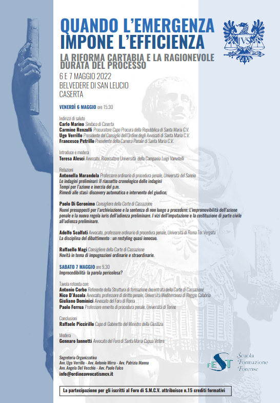 Questo il comunicato stampa del Consiglio dell’Ordine degli Avvocati di Santa Maria Capua Vetere: "Le numerose novità introdotte dalla “Riforma Cartabia”, tra cui l’esigenza di accelerare il processo penale, potenziare le garanzie difensive e della tutela della vittima del reato e apportare un’innovazione della ragionevole durata del giudizio di impugnazione, costituiranno a breve il “nuovo sistema penale” con cui l’avvocatura e la magistratura dovranno confrontarsi. A tal proposito il Consiglio dell’Ordine degli Avvocati di Santa Maria Capua Vetere ha organizzato - si legge - un convegno con la presenza di professionalità di primo livello in ambito nazionale sul tema: “Quando l’emergenza impone l’efficienza - La riforma Cartabia e la ragionevole durata del processo”. Il Convegno si terrà in Caserta presso il Real Sito del Belvedere di San Leucio nei giorni 6 e 7 maggio del 2022. Lo stesso si svolgerà il giorno 6 maggio dalle ore 15.30 con le relazioni: della Prof.ssa Antonella Marandola Professore Ordinario di procedura penale dell’Università del Sannio; del Dott. Paolo Di Geronimo Consigliere della Corte di Cassazione; dell’Avv. Adolfo Scalfati Professore ordinario di procedura penale dell’Università di Roma Tor Vergata; del Dott. Raffaello Magi Consigliere della Corte di Cassazione. A moderare tali interventi sarà l’Avv. Teresa Alesci Ricercatore dell’Università della Campania Luigi Vanvitelli. Seguirà - quindi - una tavola rotonda il giorno 7 maggio dalle ore 9.30 con gli interventi: del Dott. Antonio Corbo Referente della Struttura di formazione decentrata della Corte di Cassazione; dell’Avv. Vincenzo Nico D’Ascola professore di diritto penale dell’Università Mediterranea di Reggio Calabria; dell’Avv. Giuliano Dominici del Foro di Roma. Le conclusioni saranno affidate al Dott. Raffaele Piccirillo Capo di Gabinetto del Ministro della Giustizia. A moderare la tavola rotonda sarà l’Avv. Gennaro Iannotti del Foro di S. Maria C.V. Le parole del Presidente Avvocato Ugo Verrillo: “l’evento organizzato dal Consiglio dell’Ordine degli Avvocati di Santa Maria Capua Vetere e dalla Forazione Fest, rappresenta un’opportunità eccezionale per tutti gli operatori del diritto. La presenza di relatori di primo livello nazionale - dice - che ringrazio per aver aderito all’invito, ci onora e si sprona a fare ancora di più e meglio per la formazione della nostra Classe. Esprimo gratitudine nei confronti del Sindaco del Comune di Caserta, collega avvocato Carlo Marino, per averci ospitato presso la prestigiosa sede del Belvedere di San Leucio. Un ringraziamento speciale alla Fondazione Fest ed alla Presidnete Patrizia Manna,ai moderatori del convegno, che daranno lustro al nostro Foro, ed ai membri della segreteria organizzativa per l’impegno assunto“ - conclude".