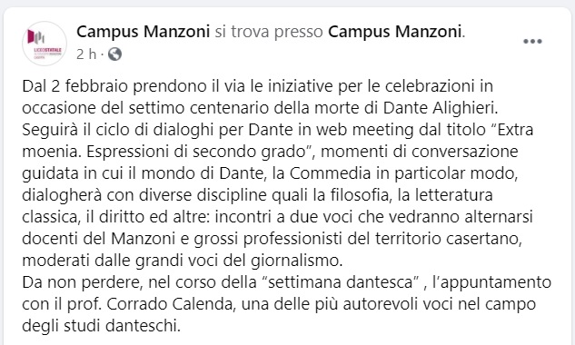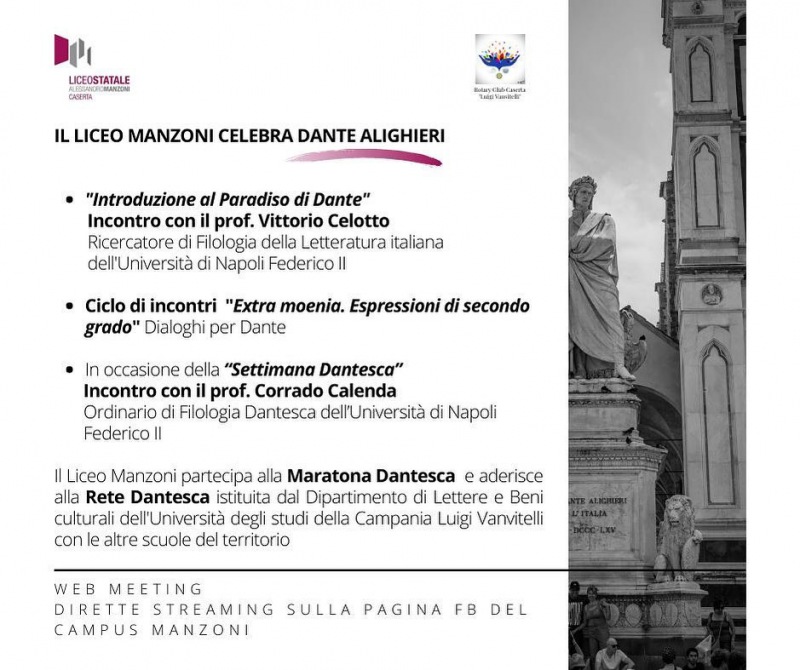 Questo quanto apprendiamo dalla pagina fb del Campus Manzoni: "Dal 2 febbraio prendono il via le iniziative per le celebrazioni in occasione del settimo centenario della morte di Dante Alighieri. Seguirà - si legge nella nota - il ciclo di dialoghi per Dante in web meeting dal titolo “Extra moenia. Espressioni di secondo grado”, momenti di conversazione guidata in cui il mondo di Dante, la Commedia in particolar modo, dialogherà con diverse discipline quali la filosofia, la letteratura classica, il diritto ed altre: incontri a due voci che vedranno alternarsi docenti del Manzoni - si legge nella nota - e grossi professionisti del territorio casertano, moderati dalle grandi voci del giornalismo. Da non perdere, nel corso della “settimana dantesca”, l’appuntamento con il prof. Corrado Calenda, una delle più autorevoli voci nel campo degli studi danteschi."