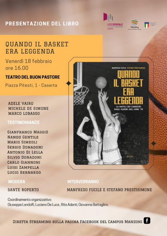 "Nel quadro di una serie d’iniziative tese a valorizzare lo sport come bene culturale, il Liceo Alessandro Manzoni ha organizzato per Venerdì 18 febbraio 2022, alle ore 16:00, in presenza presso il teatro del Buon Pastore di Caserta, la presentazione del libro “Quando il basket era leggenda – la Napoli dei canestri dagli albori agli anni ‘70” di Manfredo Fucile e Stefano Prestisimone, edito da LeVarie. -Si legge nella nota- L’incontro, che sarà trasmesso anche in diretta sui canali social del Campus Manzoni, sarà moderato da Sante Roperto, docente universitario dell’Università di Napoli “Federico II”, giornalista e scrittore, e vedrà gli interventi di Adele Vairo dirigente scolastico del Liceo Manzoni di Caserta e Michele De Simone delegato provinciale del Coni di Caserta, degli autori Manfredo Fucile e Stefano Prestisimone, in duplice veste di atleti e dirigenti sportivi, e di Marco Lobasso editore e giornalista sportivo, attualmente capo della redazione sportiva di “Leggo”. Ad arricchire la tavola rotonda con la loro preziosa presenza ci saranno i veterani del basket casertano: Sergio Donadoni, Antonio Di Lella, Nando Gentile, Carlo Giannoni, Luigi Zampella, Mario Simeoli, Silvio Donadoni e Gianfranco Maggiò. -Si legge nella nota- Quest’ultimo figlio di una famiglia che investì in modo oculato per far sì che la realtà del basket casertano crescesse in modo organico e senza squilibri sociali, portando nel 1991 la squadra di pallacanestro Phonola a un’impresa sportiva dal valore sociale immenso, come non era mai successo che una squadra del Mezzogiorno vincesse lo scudetto, e nessun’altra squadra del Sud, ancora oggi, è riuscita a portare a casa quest’ambito trofeo. Il libro racconta la storia del basket partenopeo dai primordi del 1912 vigilia della Grande Guerra fino all’epopea della squadra Partenope Napoli Basket degli anni ‘70. -Si legge nella nota- Un volume ricco di storie e aneddoti, un prezioso documento di studio per i nostri giovani studenti del Liceo Scientifico a Potenziamento Sportivo, perché sarà da supporto didattico per sviluppare, attraverso la chiave di lettura della storia di questo sport a stelle e strisce, una consapevolezza sempre più approfondita sullo sport, con la conseguente sua utile conoscenza. Perché lo sport sia sempre più elemento di crescita culturale e di pace tra popoli. L’evento è stato promosso dal dirigente scolastico Adele Vairo, in sinergia con il Dipartimento di Scienze Motorie e Sportive, è stato coordinato dal professor Luciano De Luca e dal direttore della radioweb Manzoni professor Giuseppe Landolfi, ed ha ottenuto il patrocinio del Comitato Fair Play accordato dal presidente Ruggero Alcanterini."