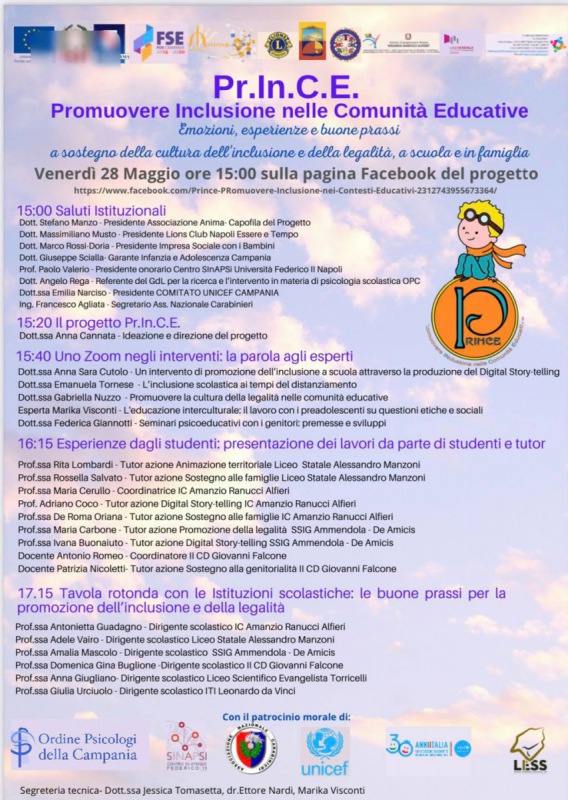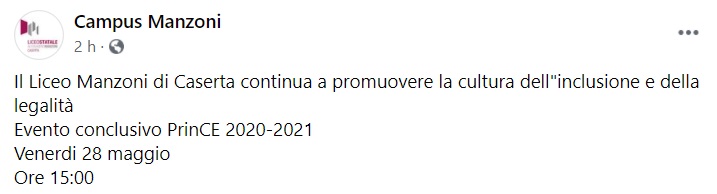 Questo quanto apprendiamo dalla pagina fb del Campus Manzoni: "Il Liceo Manzoni di Caserta continua a promuovere la cultura dell'inclusione e della legalità - si legge nella nota - Evento conclusivo PrinCE 2020-2021 Venerdi 28 maggio Ore 15:00"