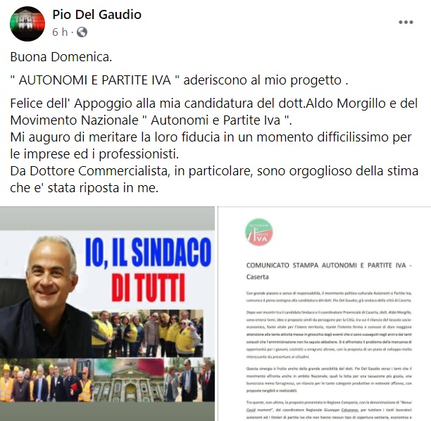 "Con grande piacere e senso di responsabilità, il movimento politico-culturale Autonomi e Partite Iva, comunica il pieno sostegno alla candidatura del dott. Pio Del Gaudio, già sindaco della città di Caserta. Dopo vari incontri- si legge nella nota- tra il candidato Sindaco e il coordinatore Provinciale di Caserta, dott. Aldo Morgillo, sono emersi temi, idee e proposte simili da perseguire per la Città, tra cui il rilancio del tessuto socio-economico, fonte vitale per l’intero territorio, stante l’intento fermo e comune di dare maggiore attenzione alle tante attività messe in ginocchio dagli eventi che si sono susseguiti negli anni e dai tanti ostacoli che l’amministrazione non ha saputo abbattere. Si è affrontato il problema della mancanza di opportunità per i giovani, costretti a emigrare altrove, con la proposta di un piano di sviluppo molto interessante da presentare ai cittadini. Questa sinergia è frutto anche della grande sensibilità del dott. Pio Del Gaudio verso i temi che il movimento affronta- si legge nel comunicato- anche in ambito Nazionale, quali la lotta per una tassazione più giusta, una burocrazia meno farraginosa, un rilancio per le tante categorie produttive in notevole affanno, con proposte tangibili e realizzabili. Tra queste, non ultima, la proposta presentata in Regione Campania, con la denominazione di “Bonus Covid moment”, dal coordinatore Regionale Giuseppe Calvanese, per tutelare i tanti lavoratori autonomi ed i titolari di partita iva che non hanno nessun tipo di copertura sanitaria, economica e sociale. Alla base di tutto c’è- si legge nella nota- un grande lavoro di vicinanza ai cittadini, che si vuole realizzare anche per la città di Caserta."