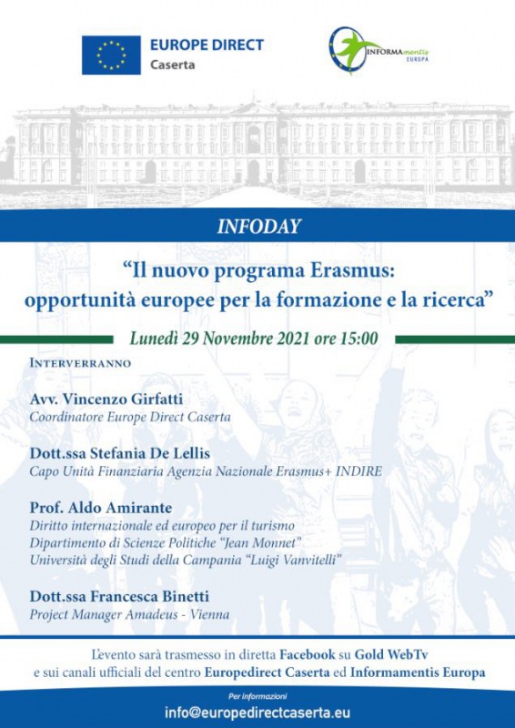 Nuovo appuntamento di Informamentis Europa e Europe Direct Caserta, che organizzano per lunedì 29 novembre alle ore 15:00 il seminario, che sarà trasmesso in diretta sulla nostra pagina facebook Gold WebTv, dal titolo "Il nuovo programma Erasmus: opportunità europee per la formazione e la ricerca". Oltre all'avv. Vincenzo Girfatti, interverranno la dott.ssa Stefania De Lellis capo unità finanziaria agenzia nazionale Erasmus* Indire, il prof. Aldo Amirante docente Diritto Internazionale ed Europeo Dipartimento Scienze Politiche Jean Monnet Università degli Studi della Campania, e la dott.ssa Francesca Binetti project manager Amadeus - Vienna.