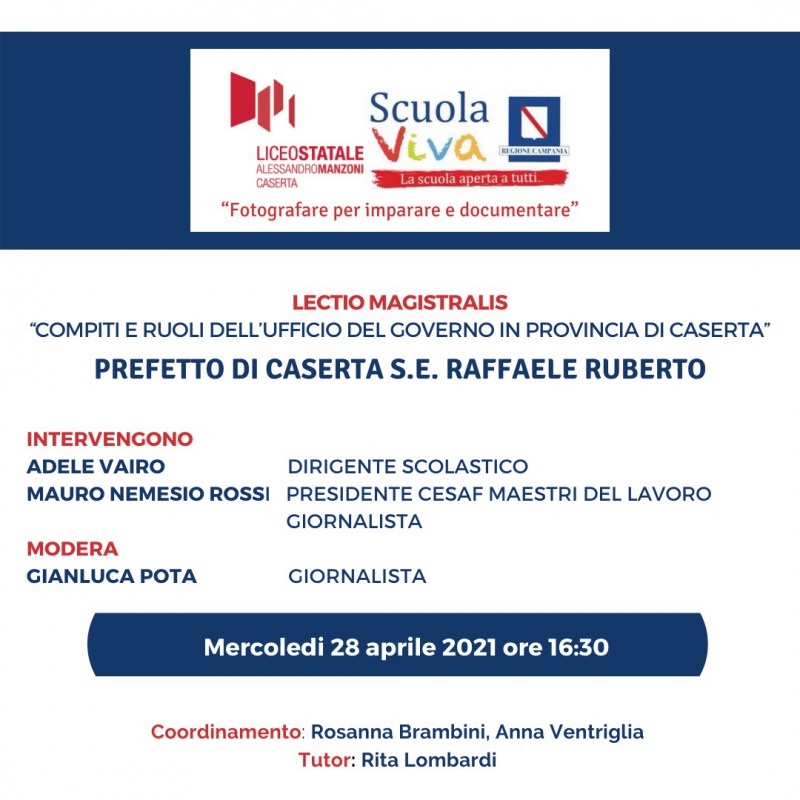 "«I compiti e il ruolo dell’Ufficio del Governo in provincia di Caserta». È questo il titolo della lectio magistralis di mercoledì alle ore 16:30 organizzata dal liceo Manzoni di Caserta e che avrà come protagonista assoluto il Prefetto di Caserta, Raffaele Ruberto. L’incontro, trasmesso sulla pagina facebook “Campus Manzoni”, sarà introdotto dalla Dirigente Scolastica del liceo Manzoni, Adele Vairo, e dal giornalista e presidente del Cesaf Maestri del Lavoro, Mauro Nemesio Rossi. -Si legge nella nota- A moderare gli interventi è il giornalista Gianluca Pota. «La visita del massimo rappresentante del Governo nella provincia al liceo Manzoni ci riempie di sano orgoglio – ha commentato la Dirigente Scolastica del liceo Manzoni, Adele Vairo –. Ringraziamo il Prefetto Raffaele Ruberto per la sua vicinanza non solo alle fasce giovanili del territorio, ma anche al liceo Manzoni dal momento che non è la prima volta che è ospite del rinomato liceo casertano. Recentemente, infatti, proprio nell’ambito di un altro progetto ‘Scuola viva’, il Prefetto Ruberto ha guidato i manzoniani attraverso la quadreria del Palazzo Acquaviva, sede della Prefettura, mostrando le diverse stanze in cui si articola il palazzo e offrendo loro importanti contributi di carattere storico». -Si legge nella nota- L’iniziativa si inserisce nel più ampio progetto ‘fotografare per imparare e documentare’ inquadrato nell’ambito del modulo di ‘scuola viva’. Promossa proprio dal Cesaf Maestri del Lavoro e dal suo presidente Mauro Nemesio Rossi, la lectio magistralis di mercoledì è stata organizzata con il coordinamento tecnico delle docenti Rosanna Brambini e Anna Ventriglia, e con il tutoraggio di Rita Lombardi."