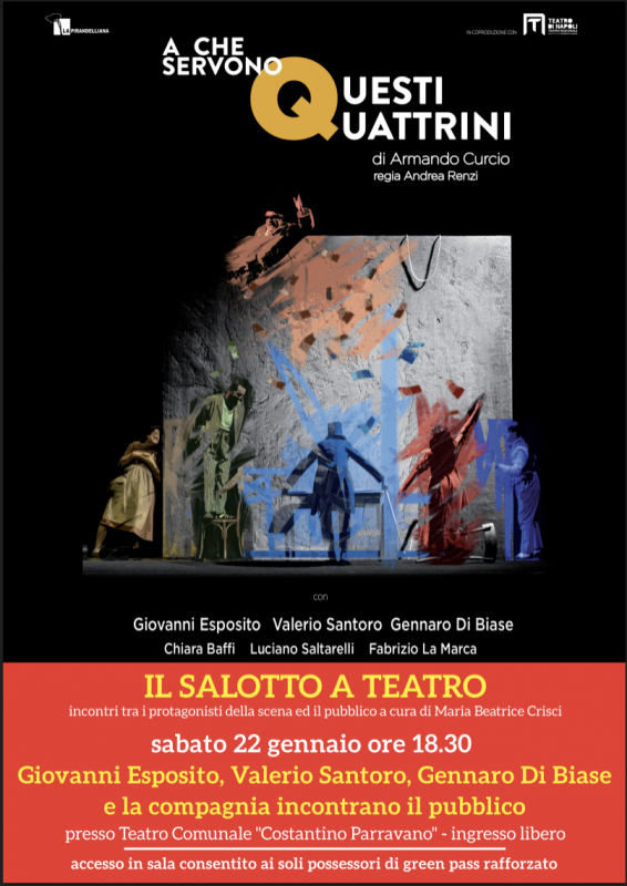 "“Il Salotto a Teatro, il ciclo di incontri tra i protagonisti della scena e il pubblico, torna sabato 22 gennaio alle ore 18,30 al Teatro Comunale di Caserta. Ospiti de “Il Salotto a Teatro”, curato dalla giornalista Maria Beatrice Crisci, saranno Giovanni Esposito, Valerio Santoro e Gennaro Di Biase. Con loro anche gli altri attori della compagnia in scena da venerdì 21 a domenica 23 gennaio al Comunale Costantino Parravano con lo spettacolo «A che servono questi quattrini» di Armando Curcio. -Si legge nella nota- La regia è di Andrea Renzi. L'evento potrà essere seguito anche sulla pagina facebook de Il Salotto a Teatro. L'incontro è libero con accesso in sala consentito ai soli possessori di green pass rafforzato. “Il Salotto a Teatro”, incontri tra i protagonisti della scena e il pubblico, nasce con lo scopo di contribuire a superare la barriera tra palcoscenico e platea, mettendo in diretto rapporto registi, attori, autori con gli spettatori e con tutti quanti amino il mondo teatrale. -Si legge nella nota- Conoscendo la trama dello spettacolo, la sua genesi culturale, le caratteristiche della regia, l’interiore approccio interpretativo degli attori, il pubblico potrà ancora meglio apprezzare la rappresentazione e scorgere cosa ci sia sotto la maschera di scena. Si tratta sicuramente di una bella opportunità artistica e culturale che permette al pubblico di conoscere da vicino gli artisti in scena al Teatro comunale Costantino Parravano."