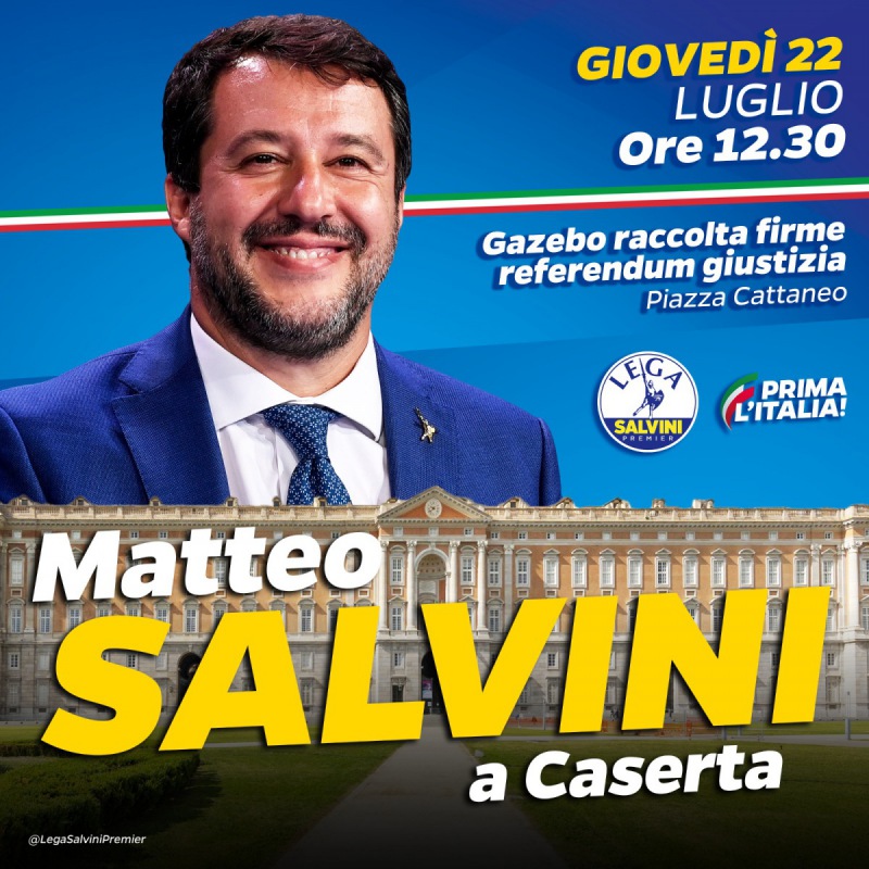 Nella gioranta di oggi, giovedì 22 luglio, il Segretario della Lega Matteo Salvini sarà a Caserta, presso il Gazebo per la raccolta firme del referendum giustizia a Piazza Cattaneo. L'appuntamento è per le ore 12.30.