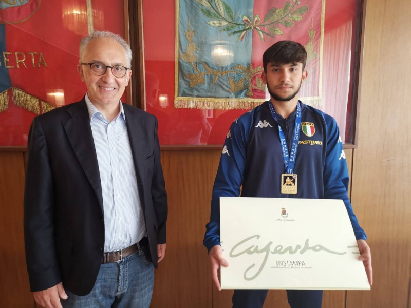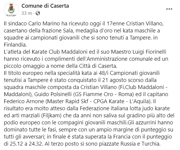 "Il sindaco Carlo Marino ha ricevuto oggi il 17enne Cristian Villano, casertano della frazione Sala, medaglia d’oro nel kata maschile a squadre ai campionati giovanili che si sono tenuti a Tampere. in Finlandia. L’atleta del Karate Club Maddaloni ed il suo Maestro Luigi Fiorinelli hanno ricevuto- si legge nella nota- i complimenti dell’Amministrazione comunale ed un piccolo omaggio a nome della Città di Caserta. Il titolo europeo nella specialità kata ai 48/i Campionati giovanili tenutisi a Tampere è stato conquistato il 21 agosto scorso dalla squadra maschile composta da Cristian Villano (Fi.Club Maddaloni - Maddaloni), Guido Polsinelli (GS Fiamme Oro - Roma) ed il capitano Federico Arnone (Master Rapid Skf - CPGA Karate - L'Aquila). Il risultato era molto atteso dalla Federazione italiana lotta judo karate ed arti marziali (Filjkam) che da anni non saliva sul gradino più alto del podio europeo con le compagini giovanili maschili. Gli azzurrini- si legge nella nota- hanno dominato tutte le fasi, sempre con un ampio margine di punteggio su tutti gli avversari; in finale è stata superata la Francia con il punteggio di 25.12 a 24.32. Al terzo posto si sono piazzate Russia e Turchia."