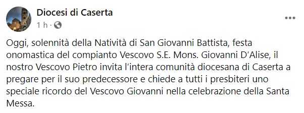 "Oggi, solennità della Natività di San Giovanni Battista, festa onomastica del compianto Vescovo S.E. Mons. Giovanni D’Alise, il nostro Vescovo Pietro invita l’intera comunità diocesana di Caserta a pregare per il suo predecessore e chiede- si legge nella nota- a tutti i presbiteri uno speciale ricordo del Vescovo Giovanni nella celebrazione della Santa Messa."