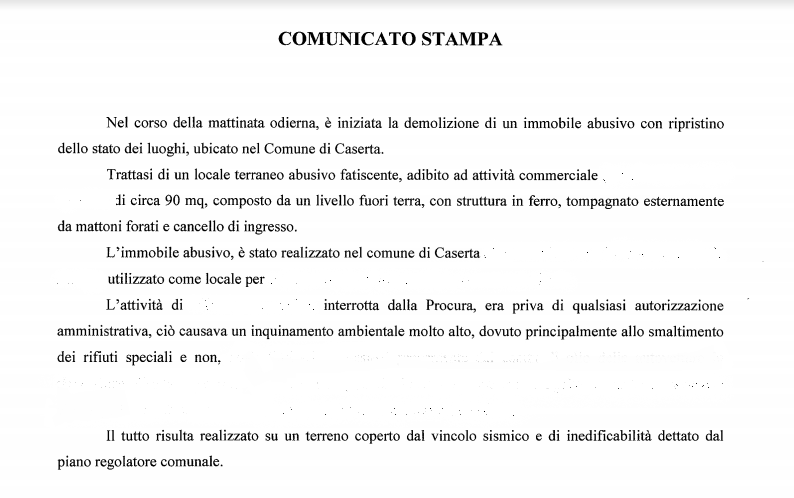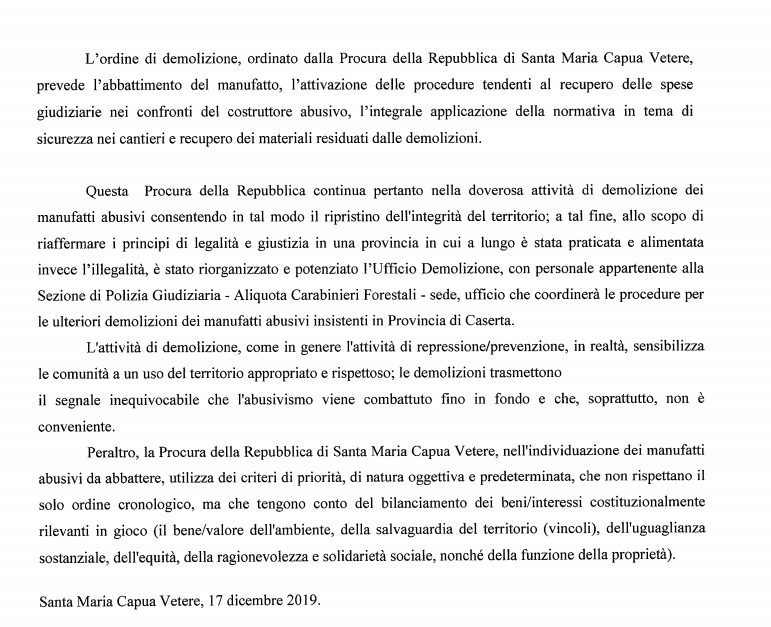 Di seguito, parte del testo del comunicato, della Procura della Repubblica, presso il Tribuale di Santa Maria Capua Vetere, giunto in redazione.