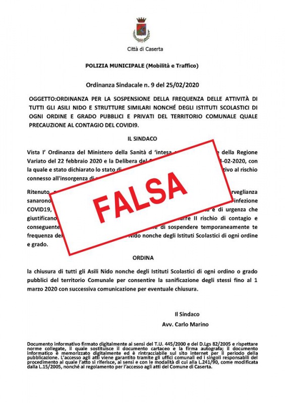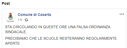 "STA CIRCOLANDO IN QUESTE ORE UNA FALSA ORDINANZA SINDACALE. PRECISIAMO CHE LE SCUOLE RESTERANNO REGOLARMENTE APERTE".