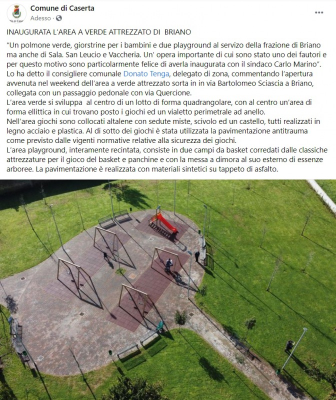 “Un polmone verde, giorstrine per i bambini e due playground al servizo della frazione di Briano ma anche di Sala. San Leucio e Vaccheria. Un’ opera importante di cui sono stato uno dei fautori e per questo motivo sono particolarmente felice di averla inaugurata con il sindaco Carlo Marino”. -Si legge nella nota- Lo ha detto il consigliere comunale Donato Tenga, delegato di zona, commentando l’apertura avvenuta nel weekend dell’area a verde attrezzato sorta in in via Bartolomeo Sciascia a Briano, collegata con un passaggio pedonale con via Quercione. L’area verde si sviluppa al centro di un lotto di forma quadrangolare, con al centro un’area di forma ellittica in cui trovano posto i giochi ed un vialetto perimetrale ad anello. Nell’area giochi sono collocati altalene con sedute miste, scivolo ed un castello, tutti realizzati in legno acciaio e plastica. -Si legge nella nota- Al di sotto dei giochi è stata utilizzata la pavimentazione antitrauma come previsto dalle vigenti normative relative alla sicurezza dei giochi. L’area playground, interamente recintata, consiste in due campi da basket corredati dalle classiche attrezzature per il gioco del basket e panchine e con la messa a dimora al suo esterno di essenze arboree. La pavimentazione è realizzata con materiali sintetici su tappeto di asfalto."