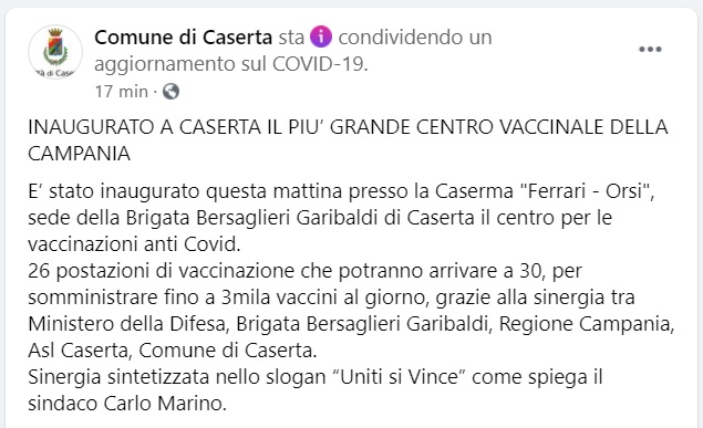Questo quanto pubblichato sulla pagina facebook del Comune di Caserta: "INAUGURATO A CASERTA IL PIU’ GRANDE CENTRO VACCINALE DELLA CAMPANIA E’ stato inaugurato questa mattina presso la Caserma "Ferrari - Orsi", sede della Brigata Bersaglieri Garibaldi di Caserta - si legge nella nota - il centro per le vaccinazioni anti Covid. 26 postazioni di vaccinazione che potranno arrivare a 30, per somministrare fino a 3mila vaccini al giorno, grazie alla sinergia tra Ministero della Difesa, Brigata Bersaglieri Garibaldi, Regione Campania, Asl Caserta, Comune di Caserta. Sinergia sintetizzata - si legge nella nota - nello slogan “Uniti si Vince” come spiega il sindaco Carlo Marino." QUI IL VIDEO
