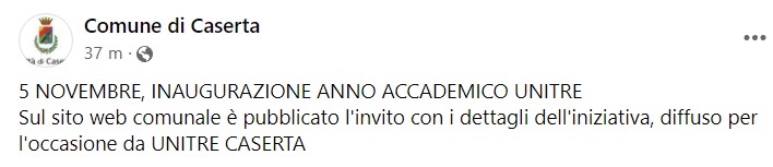 Questo quanto apprendiamo dalla pagina fb del Comune di Caserta: "5 NOVEMBRE, INAUGURAZIONE ANNO ACCADEMICO UNITRE Sul sito web comunale è pubblicato l'invito con i dettagli dell'iniziativa, diffuso per l'occasione da UNITRE CASERTA"