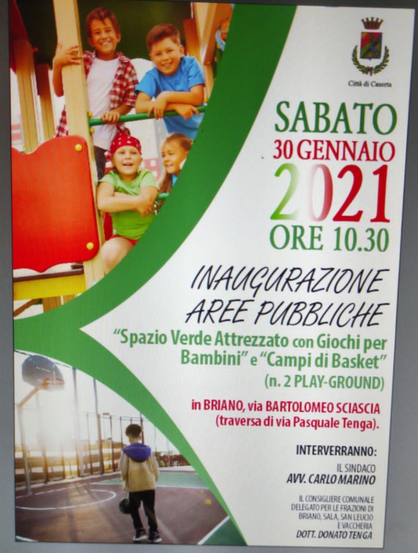 Pubblichiamo nota stampa Comune di Caserta: "Sabato 30 gennaio alle 10,30, in via Bartolomeo Sciascia a Briano, si svolgerà l’inaugurazione di un’area a verde attrezzato con giochi per bambini e due playground. Con il sindaco Carlo Marino - si legge nella nota - interverrà il consigliere delegato di zona, Donato Tenga. L’area verde è collegata con il centro storico di Briano attraverso un vialetto pedonale e si sviluppa – si legge nel progetto - al centro di un lotto di forma quadrangolare, con al centro un’area di forma ellittica in cui trovano posto i giochi ed un vialetto perimetrale ad anello. Nell’area giochi - si legge nella nota - sono collocati altalene con sedute miste, scivolo ed un castello, tutti realizzati in legno acciaio e plastica. Al di sotto dei giochi è stata utilizzata la pavimentazione antitrauma come previsto dalle vigenti normative relative alla sicurezza dei giochi. L’area playground, interamente recintata, consiste in due campi da basket di dimensioni 24.00 x 14.50, corredati dalle classiche attrezzature per il gioco del basket e panchine e con la messa a dimora al suo esterno di essenze arboree. La pavimentazione - si legge nella nota - è realizzata con materiali sintetici su tappeto di asfalto."