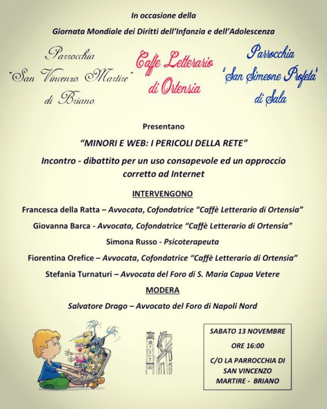 Pubblichiamo questa nota stampa: "In occasione della Giornata Mondiale dei Diritti dell’Infanzia e dell’Adolescenza, il Caffè Letterario di Ortensia, iniziativa culturale ideata dalle Avvocate Giovanna Barca, Francesca della Ratta e Fiorentina Orefice, in collaborazione con le Parrocchie “San Vincenzo Martire” di Briano e “San Simeone Profeta” di Sala - si legge nella nota -, ha organizzato un incontro-dibattito con i bambini e i ragazzi dagli 8 ai 14 anni sul tema “ Minori e web: i pericoli della rete” che si terrà il giorno 13 novembre alle h. 16 presso i locali della Chiesa di Briano. L’iniziativa è volta a promuovere un uso consapevole del web e dei social network e un approccio corretto ad Internet tra le nuove generazioni. Il dibattito sarà moderato da Salvatore Drago - avvocato del Foro di Napoli Nord - e, oltre alle tre avvocate Barca, Orefice e Della Ratta, da sempre in prima linea nella lotta contro le disuguaglianze e le discriminazioni di ogni tipo - si legge nella nota -, vi prenderanno parte la dott.ssa Simona Russo - psicoterapeuta - e l’avvocata Stefania Turnaturi."