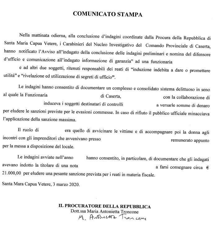 Pubblichiamo nota stampa della Procura della Repubblica di SMCV