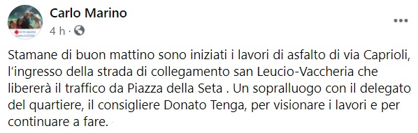 Questo quanto apprendiamo dal profilo fb del Sindaco Marino: "Stamane di buon mattino sono iniziati i lavori di asfalto di via Caprioli, l’ingresso della strada di collegamento san Leucio-Vaccheria che libererà il traffico da Piazza della Seta - si legge nella nota -. Un sopralluogo con il delegato del quartiere, il consigliere Donato Tenga, per visionare i lavori e per continuare a fare."