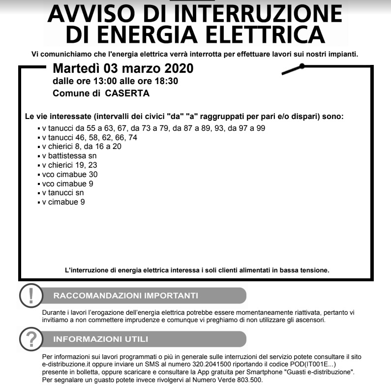 Questo quanto comunicato in una nota stampa dal Comune di Caserta, per l'interruzione dell'energia elettrica il giorno 3 marzo dalle 13:00 alle 18:30