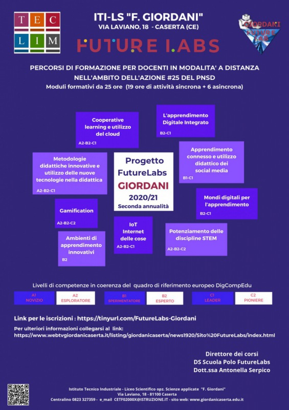Ripartono le attività di formazione per i docenti del progetto FutureLabs Giordani 20/21 erogate in modalità "online". L’ITI-LS Giordani scuola polo FutureLabs per le provincie di Caserta, Avellino e Benevento, in seguito all’autorizzazione del Ministero dell’Istruzione -si legge nella nota-avvia la seconda annualità dei corsi di formazione per docenti, previsti dall’Azione #25 del Piano Nazionale per la Scuola Digitale (PNSD), sulle metodologie didattiche innovative, in modalità FaD (Formazione a distanza) con partecipazione a videoconference, realizzazione di attività laboratoriali online, ecc..).-spiega la nota-Sono previsti percorsi formativi rivolti a tutti i docenti, delle scuole di ogni ordine e grado, che hanno bisogno di metodologie e strumenti digitali di base o avanzati, per poter attivare con efficacia ed inclusione la didattica digitale integrata anche in DaD (Didattica a distanza) con i propri alunni. Tutti i corsi -spiega la nota-avranno una durata di 25 ore totali e saranno articolati in sessioni in videoconferenza interattiva per un totale di 19 ore, durante le quali saranno realizzate attività formative, ed attività laboratoriali, più 6 ore in modalità asincrona per la realizzazione di un project work. I temi affrontati sono: