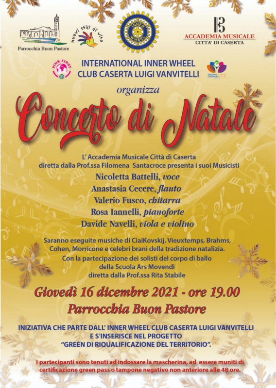 Questo il comunicato stampa diffuso dall'Accademia musicale Città di Caserta: "L'Accademia musicale Città di Caserta sarà protagonista del Concerto di Natale in programma per giovedì 16 dicembre alle 19. L’evento, organizzato dall’International Inner Wheel Club Caserta Luigi Vanvitelli, si terrà - si legge nel comunicato - nella Parrocchia del Buon Pastore. Questi i musicisti dell’Accademia musicale diretta da Mena Santacroce: Nicoletta Battelli voce, Anastasia Cecere flauto, Valerio Fusco chitarra, Rosa Iannelli pianoforte, Davide Navelli viola e violino. Saranno eseguite musiche diTchaikovsky, Vieuxtemps, Brahms, Cohen. E ancora, Morricone e celebri brani della tradizione natalizia. La kermesse musicale - prosegue il comunicato - vedrà la partecipazione dei solisti del corpo di ballo della Scuola Ars Movendi diretta dalla professoressa Rita Stabile. L’iniziativa che parte dall’Inner Wheel Club Caserta Luigi Vanvitelli si inserisce nel progetto “Green di riqualificazione del territorio”. Per l’ingresso - conclude il comunicato - obbligo di mascherina e green pass".