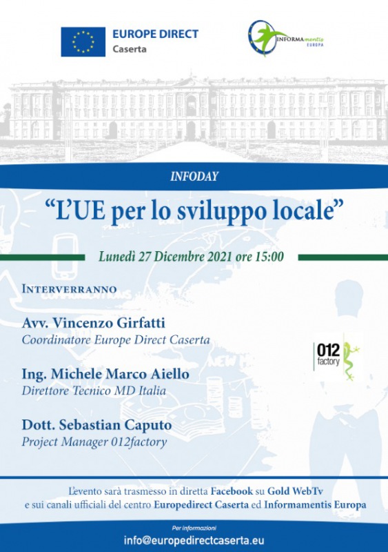 Un nuovo appuntamento in diretta sulla pagina facebook di Gold WebTv lunedì 27 dicembre 2021. Si tratta dell'evento di Europe Direct Caserta e Informamentis Europa dal titolo 'L'UE per lo sviluppo locale'. All'appuntamento interverranno l'Avv. Vincenzo Girfatti, Coordinatore di Europe Direct Caserta, l'Ing. Michele Marco Aiello, Direttore tecnico di MD Italia e il Dott. Sebastian Caputo, Project Manager di 012factory.