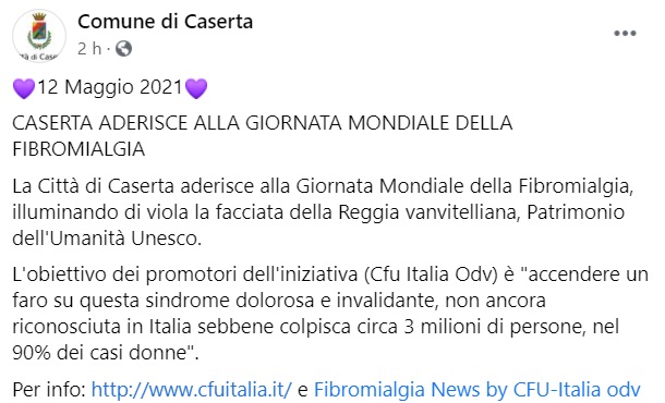 "12 Maggio 2021. CASERTA ADERISCE ALLA GIORNATA MONDIALE DELLA FIBROMIALGIA. La Città di Caserta aderisce alla Giornata Mondiale della Fibromialgia, illuminando di viola la facciata della Reggia vanvitelliana, Patrimonio dell'Umanità Unesco. L'obiettivo dei promotori dell'iniziativa (Cfu Italia Odv) è- si legge nella nota- "accendere un faro su questa sindrome dolorosa e invalidante, non ancora riconosciuta in Italia sebbene colpisca circa 3 milioni di persone, nel 90% dei casi donne". Per info: http://www.cfuitalia.it/ e Fibromialgia News by CFU-Italia odv"