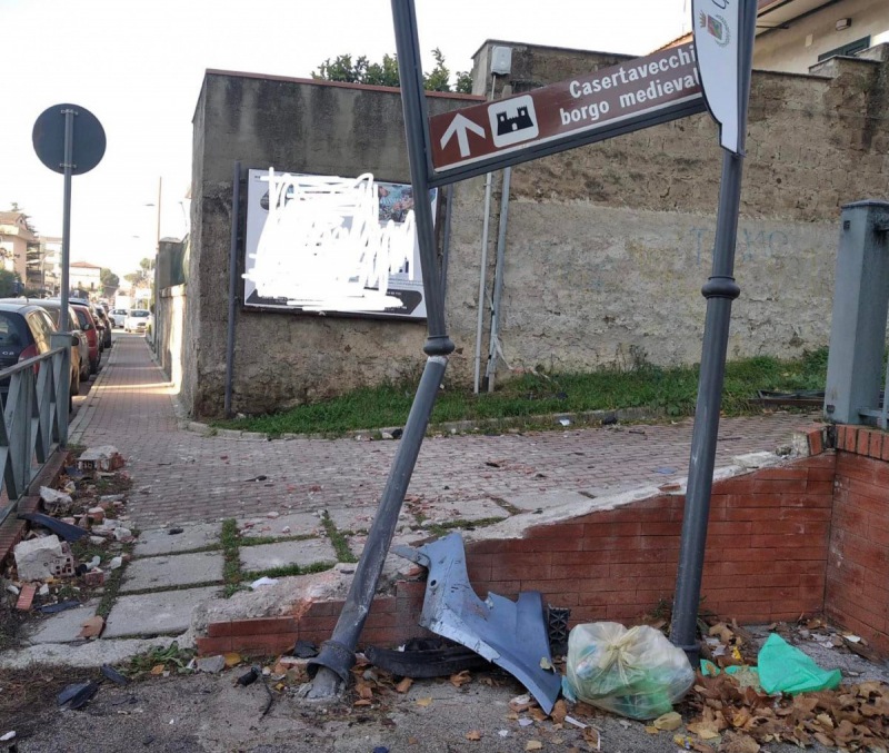 Un'auto ha perso il controllo nei pressi del Parco Cerasole a Caserta, terminando la sua corsa sul marciapiede al lato della carreggiata così da abbattere un muretto e distruggere alcuni segnali stradali. Fortunatamente non ci dovrebbero essere feriti.