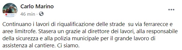 Questo quanto apprendiamo dalla pagina fb del Sindaco Marino: "Continuano i lavori di riqualificazione delle strade su via ferrarecce e aree limitrofe. Stasera un grazie al direttore dei lavori, alla responsabile della sicurezza e alla polizia municipale per il grande lavoro di assistenza al cantiere. Ci siamo."