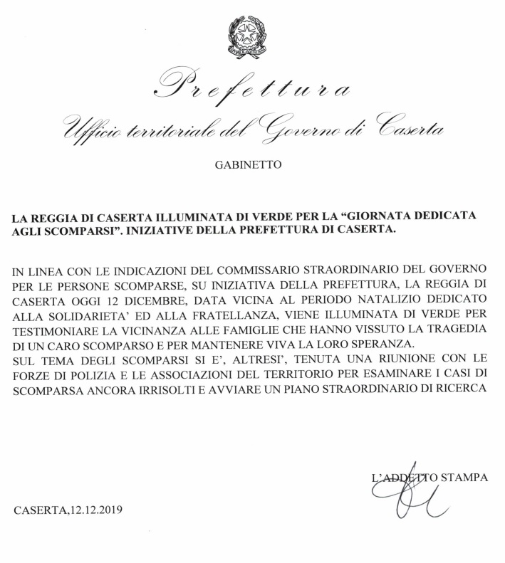 Pubblichiamo nota stampa della Prefettura di Caserta