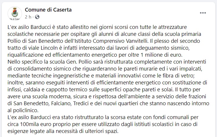 Questo quanto pubblicato sulla pagina fb del Comune di Caserta: "L'ex asilo Barducci è stato allestito nei giorni scorsi con tutte le attrezzature scolastiche necessarie per ospitare gli alunni di alcune classi della scuola primaria Pollio di San Benedetto dell'Istituto Comprensivo Vanvitelli. Il plesso del secondo tratto di viale Lincoln - si legge nella nota - è infatti interessato dai lavori di adeguamento sismico, riqualificazione ed efficientamento energetico per oltre 1 milione di euro. Nello specifico la scuola Gen. Pollio sarà ristrutturata completamente con interventi di consolidamento sismico che riguarderanno le pareti murarie ed i vari impalcati, mediante tecniche ingegneristiche e materiali innovativi come le fibra di vetro; inoltre, saranno eseguiti interventi di efficientamente energetico con sostituzione di infissi, caldaia e cappotto termico sulle superfici opache pareti e solai. Il tutto per avere una scuola moderna - si legge nella nota -, sicura e rispettosa dell'ambiente a servizio delle frazioni di San Benedetto, Falciano, Tredici e dei nuovi quartieri che stanno nascendo intorno al policlinico. L'ex asilo Barducci era stato ristrutturato la scorsa estate con fondi comunali per circa 100mila euro proprio per essere utilizzato dagli istitiuti scolastici in caso di esigenze legate alla necessità di ulteriori spazi."