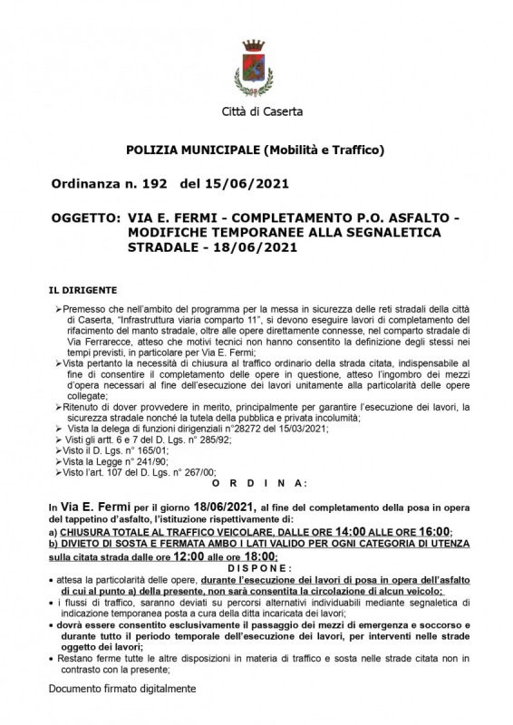 Questo quanto apprendiamo dalla pagina fb del Comune di Casera: "PIANO ASFALTI IN VIA FERMI, IL DISPOSITIVO DI TRAFFICO VIGENTE DURANTE I LAVORI DI VENERDI' 18 GIUGNO"