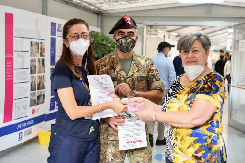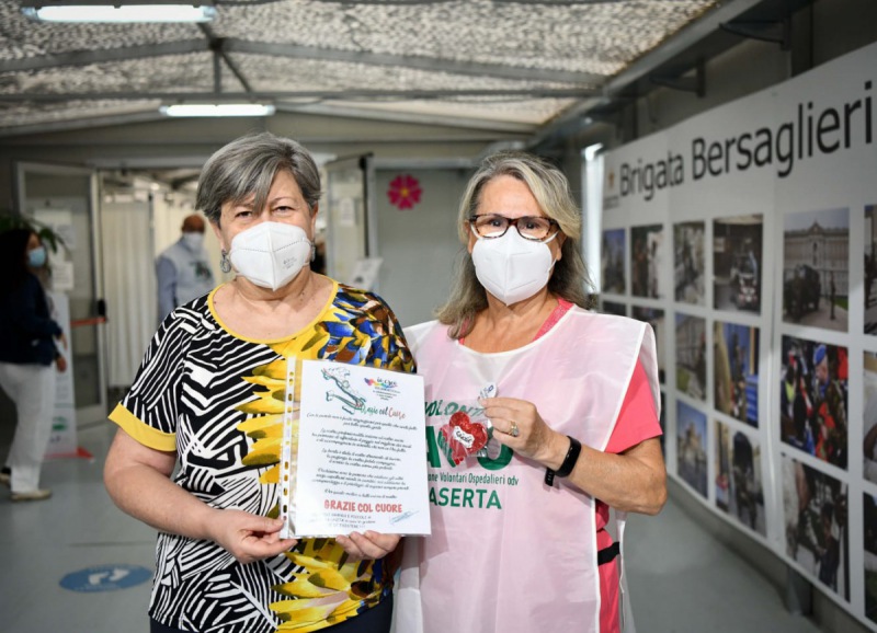 Questa mattina, presso il centro Vaccininale della Caserma Ferrari Orsi di Caserta, la referente per la Campania Marina Garbo, ha donato al personale dell'ASL, ai volontari delle associazioni impegnate presso il centro e ad una rappresentanza del personale militare della caserma, dei manufatti a forma di cuore per ringraziare tutti coloro che hanno operato in questi mesi difficili a contrastare la pandemia da Covid19. L'iniziativa promossa dalla Presidente Nazionale Antonella de Tomassi di Roma, nasce dopo aver visto le immagini dei mezzi militari che trasportavano le salme dal comune di Bergamo del 20 marzo 2020, da allora è partita una maratona di solidarietà tramite i social che ha coinvolto tantissime persone che si sono cimentate a creare manufatti a forma di cuore con materiali reperibili presso le proprie case, questi manufatti sono stati poi raccolti dai volontari dell'associazione e donati dallo scorso mese di luglio agli enti che si sono adoperati contro la pandemia. Nella giornata di oggi è toccato al centro vaccinale di Caserta, uno dei più importanti d'Italia. Ha commentato la signora Garbo: "ben sappiamo che un gesto non potrà lenire il dolore, né dissolvere la stanchezza vista così spesso sui volti degli operatori sanitari e di coloro come i militari che sono sempre stati protagonisti della lotta al Covid, ma questo gesto simbolico di donare un cuore fatto da tanti italiani, serve tuttavia a mostrare la solidarietà ed il ringraziamento a modo nostro per quello che avete fatto, che avete fatto con il Cuore!".