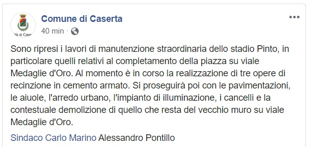 Questo quanto apprendiamo dalla pagina FB del Comune di Caserta