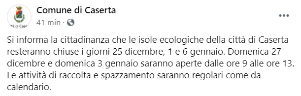 Questo quanto apprendiamo dalla pagina facebook del Comune di Caserta: