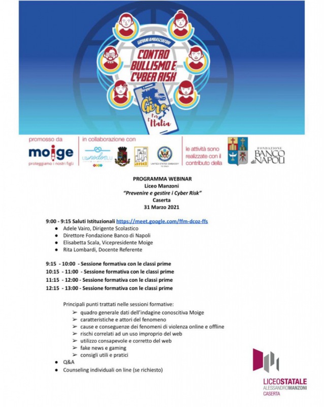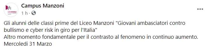 Questo quanto apprendiamo dalla pagina fb del Campus Manzoni: "Gli alunni delle classi prime del Liceo Manzoni "Giovani ambasciatori contro bullismo e cyber risk in giro per l'Italia" - si legge nella nita - Altro momento fondamentale per il contrasto al fenomeno in continuo aumento. Mercoledi 31 Marzo"