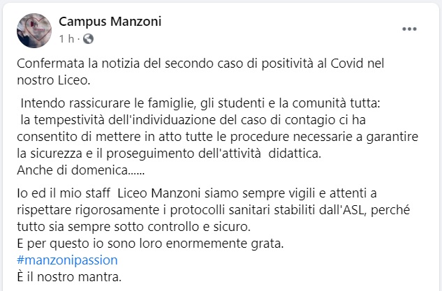 Questo quanto comunicato sulla pagina facebook dal Liceo Manzoni