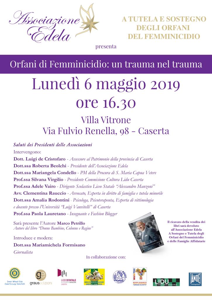 dimostrato una forte e concreta sensibilità su questo tema così delicato ed importante. Si inizierà alle 10:30 con l’incontro intitolato “Sentimenti & Violenza di Genere”,-spiega la nota- che avrà luogo presso il Liceo Statale “Alessandro Manzoni”, con sede in via Alcide de Gasperi (Caserta). Interverranno, dopo i saluti di rito, la Dott.ssa Roberta Beolchi (Presidente Onorario dell’Associazione Edela), Dott. Giovanni Saladino (Neurologo e Psicoterapeuta “Educazione ai Sentimenti”, il Dott. Carlo Iacone (Comitato Esecutivo Nazionale LIDU), l’Avv. Drusilla De Nicola (Presidente Commissione Pari Opportunità), il Dott. Marco Petrillo, autore del libro “Donne Bambine, Colonne e Regine” (Graus Edizioni, 2019), e, per concludere l’incontro mattutino, prima del consueto scambio di opinioni con gli Studenti del liceo, alcuni rappresentanti della Squadra Mobile della Questura di Caserta condivideranno alcune delle numerose esperienze, casi e denunce raccolti in anni di impegno sul territorio. L’incontro pomeridiano delle 16:30, si terrà a Villa Vitrone, in via Fulvio Renella 98-spiega la nota-(Caserta). Il convegno, intitolato “Orfani di femminicidio: un trauma nel trauma”, sarà introdotto e moderato dalla Dott.ssa Mariamichela Formisano, Giornalista del quotidiano “Il Mattino”. A conferire saranno il Dott. Luigi de Cristofaro, Assessore al Patrimonio della provincia di Caserta; Dott.ssa Roberta Beolchi (Presidente Onorario dell’Associazione Edela); Dott.ssa Mariangela Condello – PM della Procura di S. Maria Caputa Vetere; Prof.ssa Silvana Virgilio, Presidente della Commissione Lidu Caserta); Prof.ssa Adele Vairo, Dirigente Scolastico del Liceo Statale “Alessandro Manzoni”; Avvocato Clementina Rauccio, Esperta in Diritto di Famiglia e Tutela Minorile; Dott.ssa Amalia Rodontini, Psicologa, Psicoterapeuta, Esperta in Vittimologia e Docente presso l’Università “Luigi Vanvitelli” di Caserta. Tra i protagonisti dell’incontro sarà presente Marco Petrillo, autore del libro “Donne Bambine, Colonne e Regine” -si legge nella nota-(Graus Edizioni, 2019) che, attraverso filastrocche delicate e soavi, si fa portavoce di un auspicio sincero rivolto alle donne, soprattutto a coloro che sono state vittime di violenze. L’autore ha sposato appieno i princìpi dell’Associazione Edela, destinando i proventi derivanti dalle vendite del libro ai progetti volti alla tutela degli orfani di femminicidio e al sostegno delle famiglie affidatarie.-spiega la nota-La Prof.ssa Adele Vairo, dirigente scolastico del liceo A. Manzoni, che ospita l’incontro del mattino, dichiara: «L’evento nasce dalla voglia e dall’esigenza di porre l’accento su un lato poco esplorato del femminicidio, ovvero gli strascichi che questi drammatici eventi comportano sui bambini. Per questo abbiamo deciso, come corpo docente del Liceo Alessandro Manzoni, di scendere in campo al fianco di associazioni del calibro dell’Associazione Edela, che da tempo si impegna a sostenere gli orfani di femminicidio, sui quali, una volta spenti i riflettori della cronaca, troppo spesso cala un gravoso silenzio diventato Orfani invisibili.-spiega la nota-È fondamentale -conclude la dirigente- che i ragazzi vengano coinvolti in maniera sempre più importante nei progetti scolastici volti alla creazione di un dibattito, e, soprattutto, all’educazione sentimentale degli uomini e delle donne di domani». La Dott.ssa Roberta Beolchi, racconta: «L’Associazione Edela è una associazione no-profit che si estende sul territorio nazionale a tutela e sostegno degli Orfani di -si legge nella nota-Femminicidio e delle Famiglie Affidatarie. Non si può e non si deve rimanere indifferenti alla vita difficile che i bambini, dopo aver subìto il lutto per la morte della mamma con crimini efferati per mano del padre, si trovano ad affrontare da soli. Gli Orfani del femminicidio sono 2000: un esercito.Sono vittime che non si vedono, ma che vivono in mezzo a noi e continuano a soffrire silenziosamente ogni giorno»."