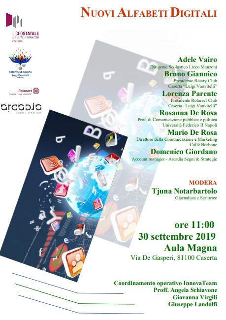 Si terrà al Liceo Manzoni di Caserta, l'evento "Nuovi Alfabeti Digitali" a cura del Team per l'Innovazione Digitale: proff. Angela Schiavone, Giuseppe Landolfi, Giovanna Virgili. L'incontro avverrà il 30 settembre, alle ore 11:00, in Aula Magna.