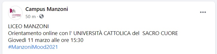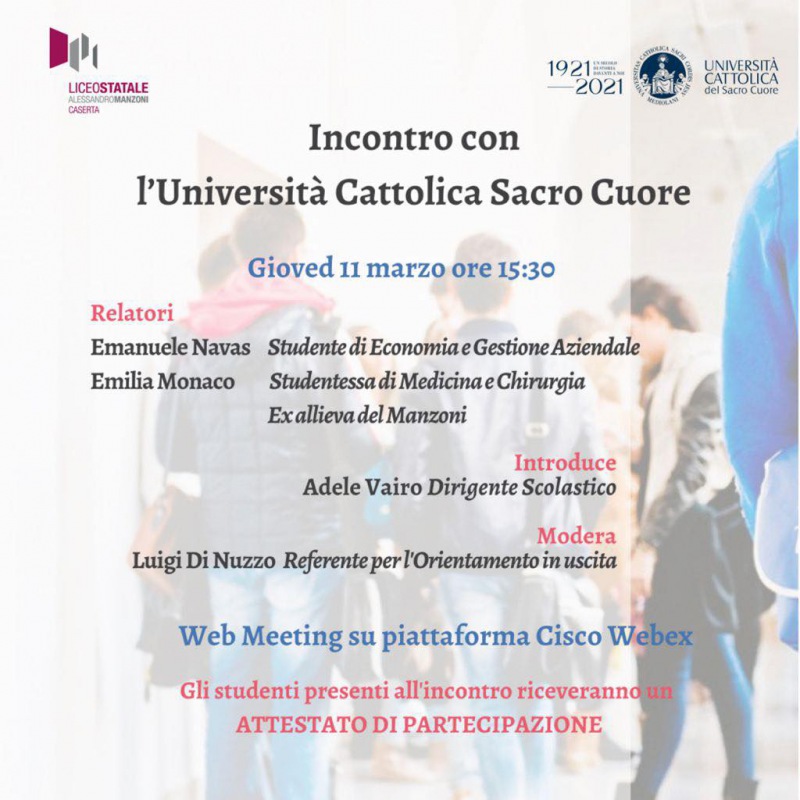 Questo quanto pubblicato sulla pagina fb del Liceo Manzoni di Caserta: "LICEO MANZONI Orientamento online con l'UNIVERSITÀ CATTOLICA del SACRO CUORE - si legge nella nota - Giovedì 11 marzo alle ore 15:30"