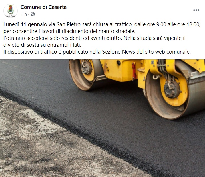 Questo quanto apprendiamo dalla pagina facebook del Comune di Caserta: