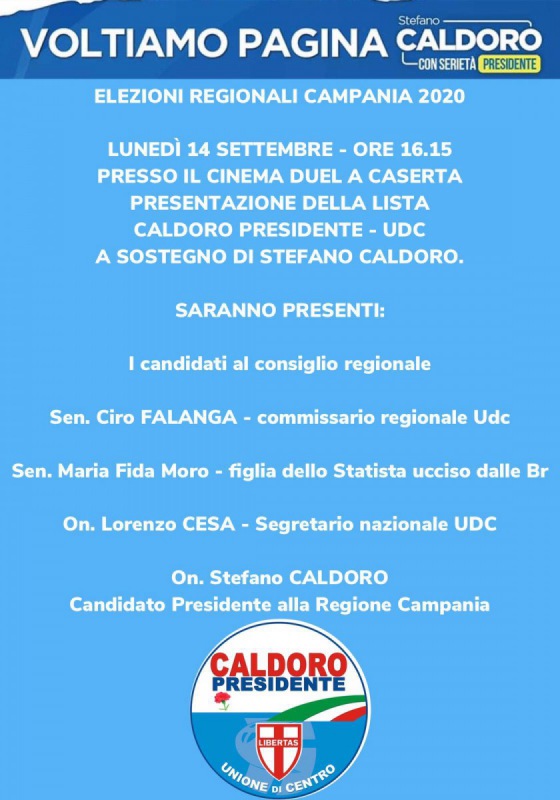 Lunedì 14 settembre alle ore 16:15 presso il cinema Duel a Caserta ci sarà la presentazione della lista "Caldoro Presidente - Udc". Presenti oltre al candidato presidente Stefano Caldoro e ai candidati al Consiglio regionale, i Senatori Ciro Falanga e Maria Fida Moro, e l'On. Lorenzo Cesa.
